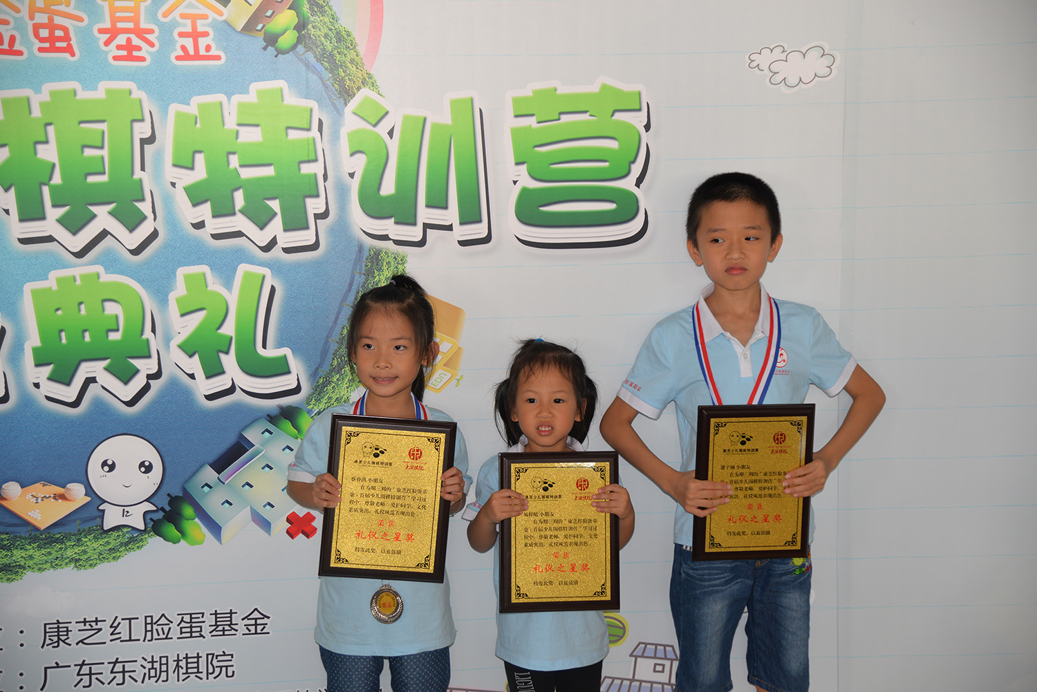 當天的對弈積分賽中,小學員們初露頭角。對弈過程遵守圍棋禮儀,舉棋落子間運籌帷幄,已頗有小棋手風范。綜合兩輪對弈賽的積分,最終排名前十位的小學員分別獲得了金、銀、銅牌。根據(jù)孩子們?nèi)芤詠淼谋憩F(xiàn),特訓營還評選出了“禮儀之星”、“飛躍之星”和“明日之星”各四名,現(xiàn)場由嘉賓為獲獎學員頒發(fā)榮譽獎牌。