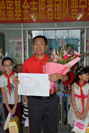 在捐贈儀式上,洪江游先生代表康芝紅臉蛋基金向軍屯小學贈送“愛心共建學?!迸曝?,并為孩子們發(fā)放愛心大禮包。孩子們則向洪董事長獻上了鮮花和自己精心繪畫的美術作品。