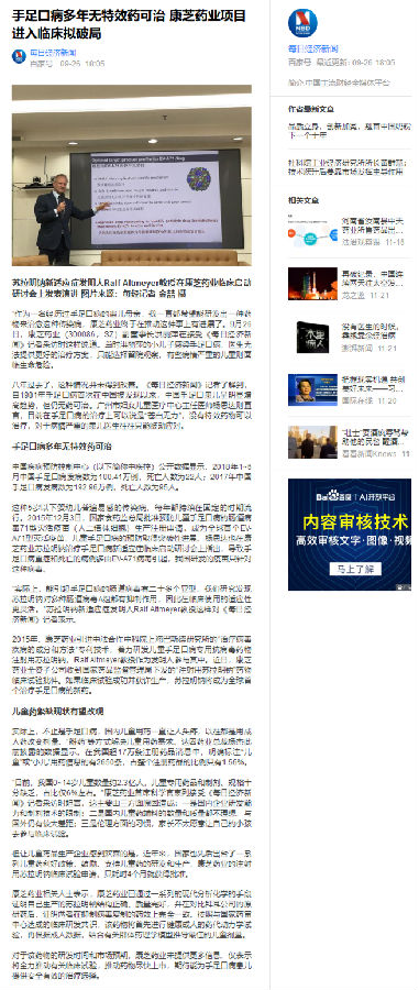 2015年,康芝藥業(yè)引進中法合作中科院上海巴斯德研究所的“治療病毒疾病的成分和方法”專利技術(shù),著力研發(fā)兒童手足口病專用抗病毒藥物注射用蘇拉明鈉,Ralf Altmeyer教授作為發(fā)明人參與其中。近日,康芝藥業(yè)全資子公司收到國家藥品監(jiān)督管理局下發(fā)的“注射用蘇拉明鈉”藥物臨床試驗批件。如果臨床試驗成功并獲許生產(chǎn),蘇拉明鈉將成為全球首個治療手足口病的新藥。