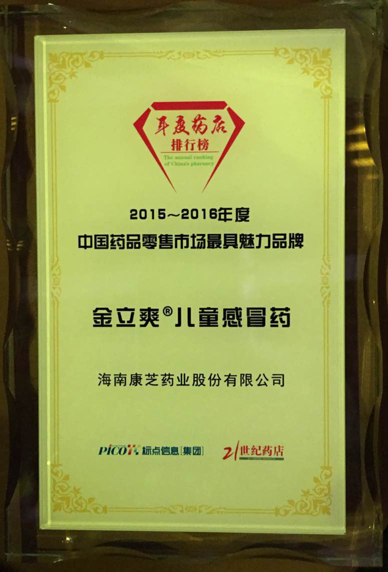 11月24日晚,由CFDA南方醫(yī)藥經(jīng)濟(jì)研究所指導(dǎo)、《21世紀(jì)藥店》舉辦的2015-2016年度中國藥品零售市場品牌評選活動(dòng)在廣州白云國際會議中心揭曉結(jié)果??抵ニ帢I(yè)旗下金立爽?兒童感冒藥在眾多品牌中脫穎而出,榮獲“2015-2016年度中國藥品零售市場最具魅力品牌”稱號。
