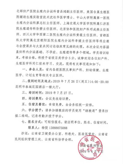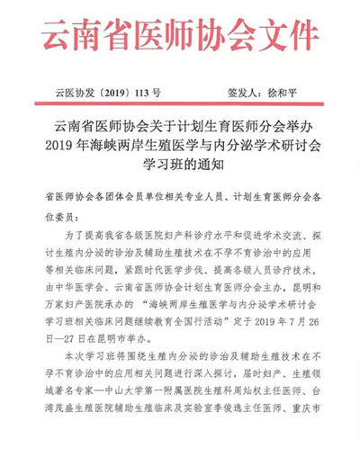 云南省醫(yī)師協(xié)會關(guān)于計劃生育醫(yī)師分會舉辦2019年海峽兩岸生殖醫(yī)學(xué)與內(nèi)分泌學(xué)術(shù)研討會學(xué)習(xí)班的通知