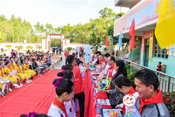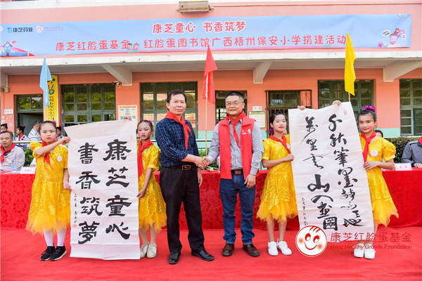 隨后,康芝藥業(yè)向卒錦坤校長贈送了“愛心共建學(xué)校”牌匾;康芝藥業(yè)副總裁李幽泉先生給學(xué)校送上了“康芝童心 書香筑夢”、“千秋筆墨驚天地 萬里云山入畫圖”兩幅書畫作品;康芝工會給孩子們帶來了一批體育用品;康芝藥業(yè)梧州代理商及診所團(tuán)隊還給孩子們送上了書包、文具等文體用品。