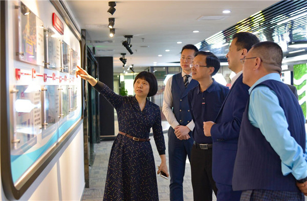 △康芝藥業(yè)副董事長兼副總裁洪麗萍(左一)向廣州市科學(xué)技術(shù)局局長王桂林(左三)一行介紹康芝情況