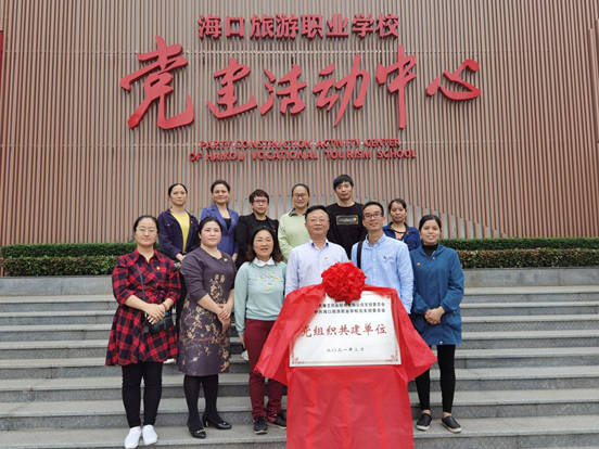 圖為康芝黨支部書記何子群與旅游學(xué)校黨支部負(fù)責(zé)人共同完成揭牌儀式