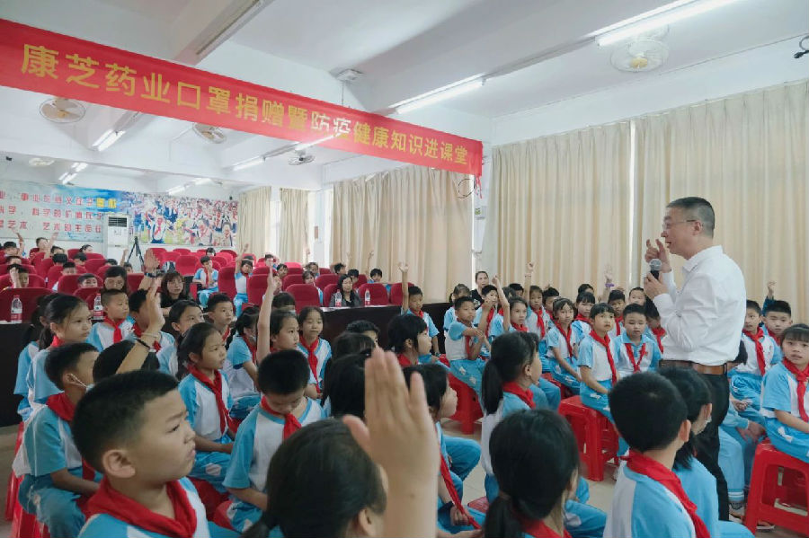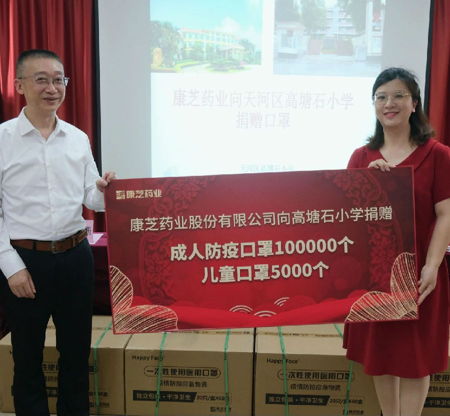 嚴慶峰總經(jīng)理一行代表康芝藥業(yè)向高塘石小學捐贈了成人一次性醫(yī)用口罩10萬個,兒童口罩5000個。校長凌文靜對康芝藥業(yè)的捐贈表示了感謝,她也期盼有更多社會力量能參與進來,給孩子們提供更多的支持和幫助。