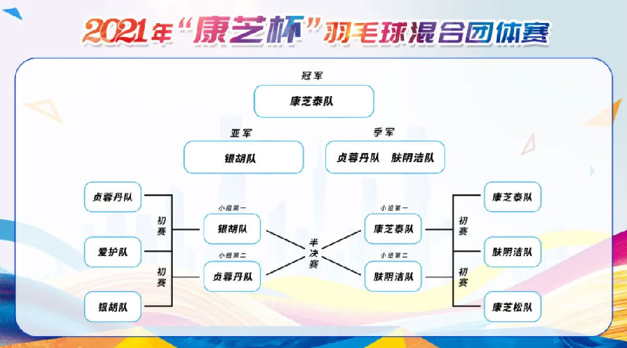 本次比賽共設(shè)混雙1、男雙、混雙2三項(xiàng)比賽,均由小組賽及決賽兩部分組成。每項(xiàng)比賽小組賽均采取隨機(jī)抽簽分組的形式兩兩對(duì)決,按三局兩勝制逐輪晉級(jí)進(jìn)入決賽;兩個(gè)小組的第一和第二交叉淘汰賽,兩支勝隊(duì)進(jìn)入總決賽。經(jīng)過(guò)激烈的角逐,比賽圓滿落下帷幕。最終,康芝泰隊(duì)奪得冠軍,銀胡隊(duì)獲得亞軍,膚陰潔隊(duì)、貞蓉丹隊(duì)并列獲得第三。