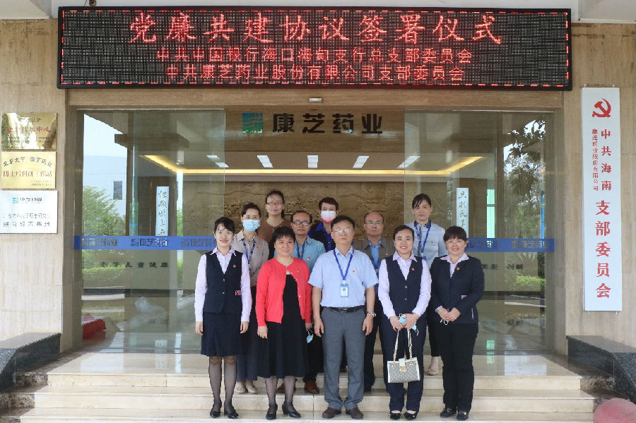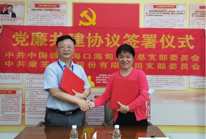 本次簽署儀式在康芝藥業(yè)海南總廠會議室舉行。儀式上,中國銀行海甸支行派駐紀檢組長吳佩珊與康芝藥業(yè)黨總支書記何子群分別致辭,各自介紹了所在單位的業(yè)務(wù)發(fā)展及黨建活動開展的情況,提出了此次黨廉共建的工作目標及思路。本著“優(yōu)勢互補,共聯(lián)共建,互利互惠,共謀發(fā)展”的共建原則,中共中國銀行??诤5橹锌傊Р课瘑T發(fā)出黨廉共建的倡議,在鮮紅的中國共產(chǎn)黨黨旗下,雙方簽訂了《黨建共建協(xié)議書》、《廉潔伙伴協(xié)議書》。