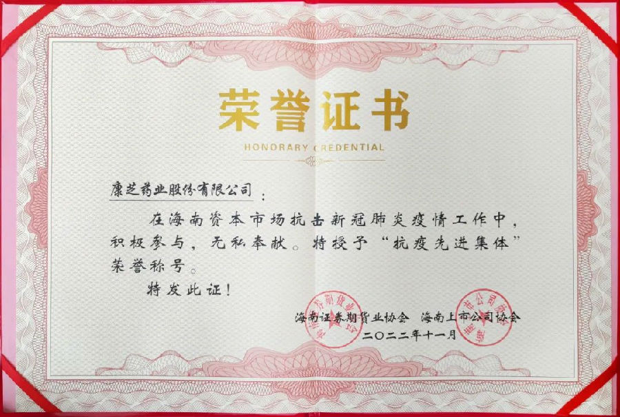 近日,在海南證監(jiān)局的指導下,海南證券期貨業(yè)協(xié)會、海南上市公司協(xié)會在??谡匍_海南資本市場抗擊新冠肺炎疫情先進事跡報告會,表彰抗疫先進個人和先進集體。會上,康芝藥業(yè)榮獲“抗疫先進集體”稱號。