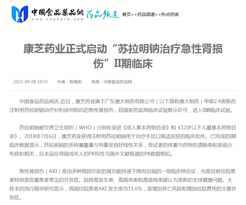 查看詳情康芝藥業(yè)旗下廣東康大制藥有限公司(以下簡稱康大制藥)申報2.4類新藥注射用蘇拉明鈉治療對利尿劑抵抗的急性腎損傷,獲國家藥監(jiān)局臨床試驗?zāi)驹S可,進(jìn)入II期臨床試驗。