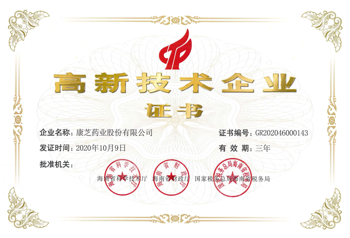 近日,康芝藥業(yè)成功通過海南省2020年高新技術企業(yè)認定名單,第五次成功認證“高新技術企業(yè)”!
